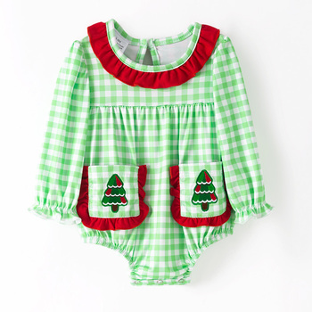 ชุดรอมเปอร์เด็กผู้หญิงสำหรับฤดูหนาวลายคริสต์มาส ปักลายซานตาคลอส สีเขียว ผ้าคอตตอนผสม พร้อมส่ง